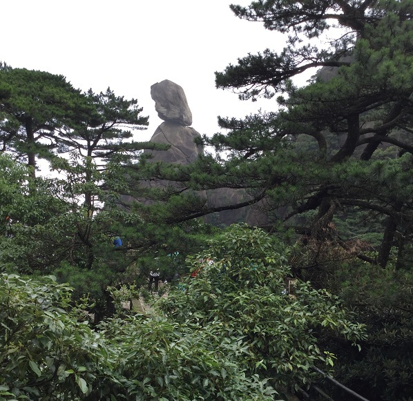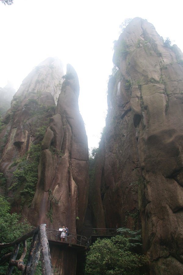 三清山的特点之三便是漫山遍野的苍松古木。它们或昂首屹立于巅峰,或俯首悬垂于崖壁,或盘根伸出岩隙,或交叉缠绕于山谷,大都以其形态命名,如“迎客松”、“华盖松”、“连理松”、“姐妹松”、“凤凰松”等等。漫步栈道,沿途1800多棵古松,远可望,近可抚;或倚道而斜,或临渊而生,或傍峰而立;苍老遒劲,仪态万方,古灵精怪。它们的生命力如此强大,旺盛,探究其原因,或得益于三清山的花岗岩地貌,它岩基裂隙多,透水性强,蓄水量大,为树木的生长提供了充足的水源保障。在栈道上行走,你会发现很多松木从栈道预留的基缝里伸出来,毫发未伤,在这样的地方,人们需要低头才能通过前行。当年修筑凌空栈道,工人未伤及一树一木,才使大家看到今天的风景,当地政府对古松木的保护和爱惜可见一斑。