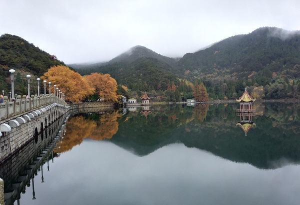 《庐山恋》电影里的男女主人公相约游泳的卢林湖,湖面平静,深秋的早上,湖面突然升起一团白雾,逐渐向我们逼近,又突然消散,让人感觉神秘而仙气十足。如琴湖是庐山区牯岭街的一处街心公园,因湖面形如乐器小提琴,所以故名"如琴湖"。如琴湖座落西谷,峰岭围抱,森林蓊蔚,环境幽雅。湖心立岛,岛内有许多人工饲养的孔雀,所以名为孔雀岛,曲桥连接,上缀水榭,形成绿水青山,相映成趣,临立岛上纵览四周妙处横生。